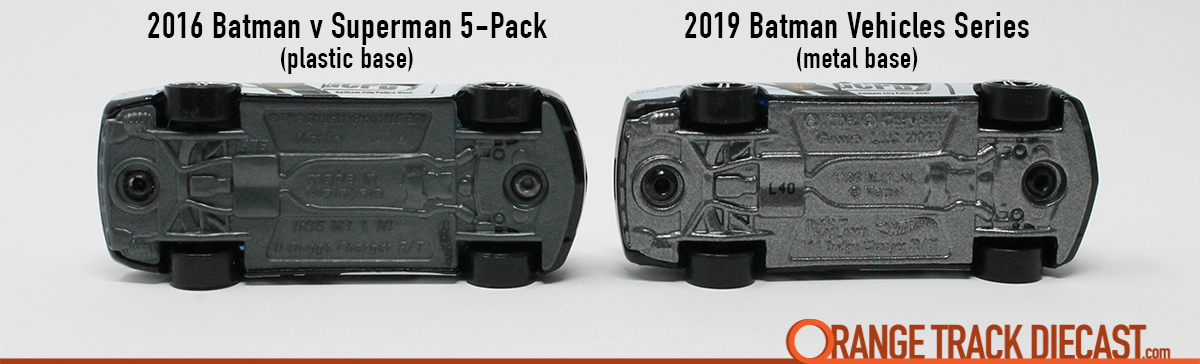 Hot Wheels ’11 Dodge Charger R/T from the Walmart Exclusive, 2019 Batman Vehicles series (right) with 2016 Batman v Superman 5-Pack release (left) … head-to-head base view with labels