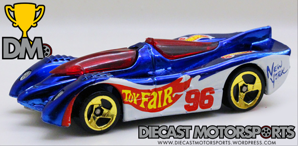 Since the body of the Power Pistons is plastic (the base is metal), that is not Spectraflame Blue paint you see, its a Blue Chrome VUM. VUM is a process in which a colorized chrome surface is applied to Hot Wheels vehicles. This can be applied to both plastic and metal bodies. This Blue Chrome VUM coupled with white sides, and “TOY FAIR” in the Hot Wheels flame logo, make this one sharp car!