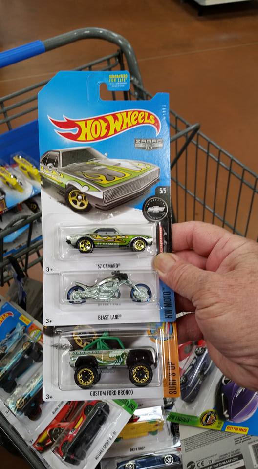 09/25/2017 — Hot on the heels of the Forza / “P” case dump bins, comes the last three #Walmart Exclusive ZAMACs which are starting to appear at U.S. Walmarts as part of a Spider-man Homecoming (sigh) / “Q” case dump bin. This will surely be a hunted assortment due to the popularity of the ’67 Camaro — even with its sealed hood and plastic base. So, if these are the last three ZAMACs you need for the year, get out there and hunt! Special thanks to Hot Wheels hunter/collector, James Elliot for supplying the pictures of his Hot Wheels haul at the Walmart in Shawnee, Oklahoma! The #ZAMACs are as follows: