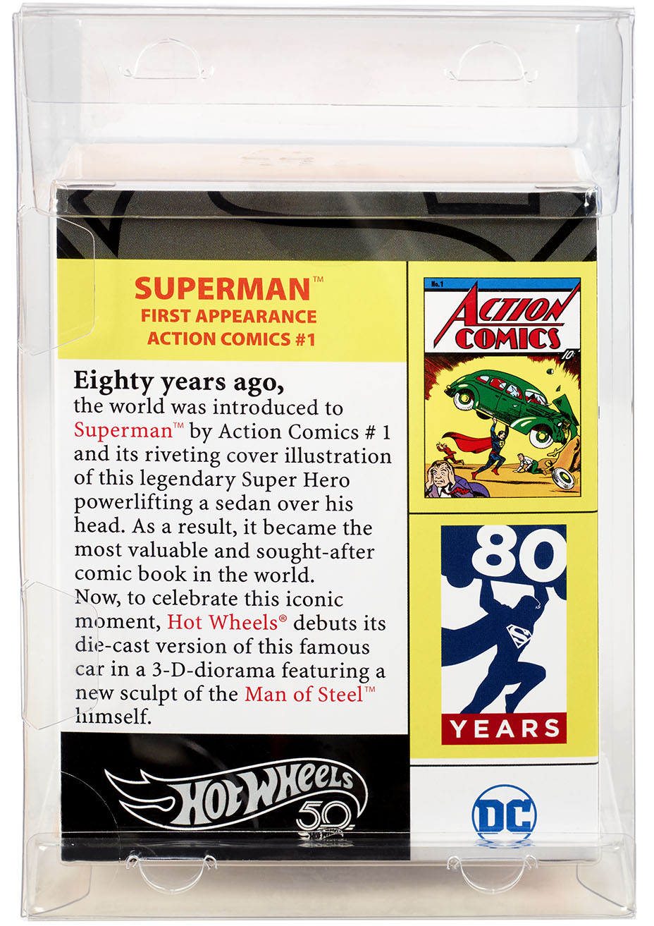 This superb multi-level packaging — which is now the new norm for Hot Wheels SDCC Exclusives — is a replica of that original cover where Superman is lifting away a green sedan, enroute to saving the innocent bystanders of Metropolis. It features a new Hot Wheels “Action Sedan” casting licensed by DC Comics and a miniature plastic Superman. It will retail for $20 at the event.