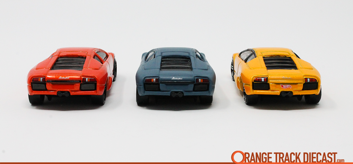 Three Hot Wheels Lamborghini Murciélago from the rear (left to right: orange 2018 Fast & Furious, matte gray 2018 Batman Vehicles & yellow 2003 First Editions)