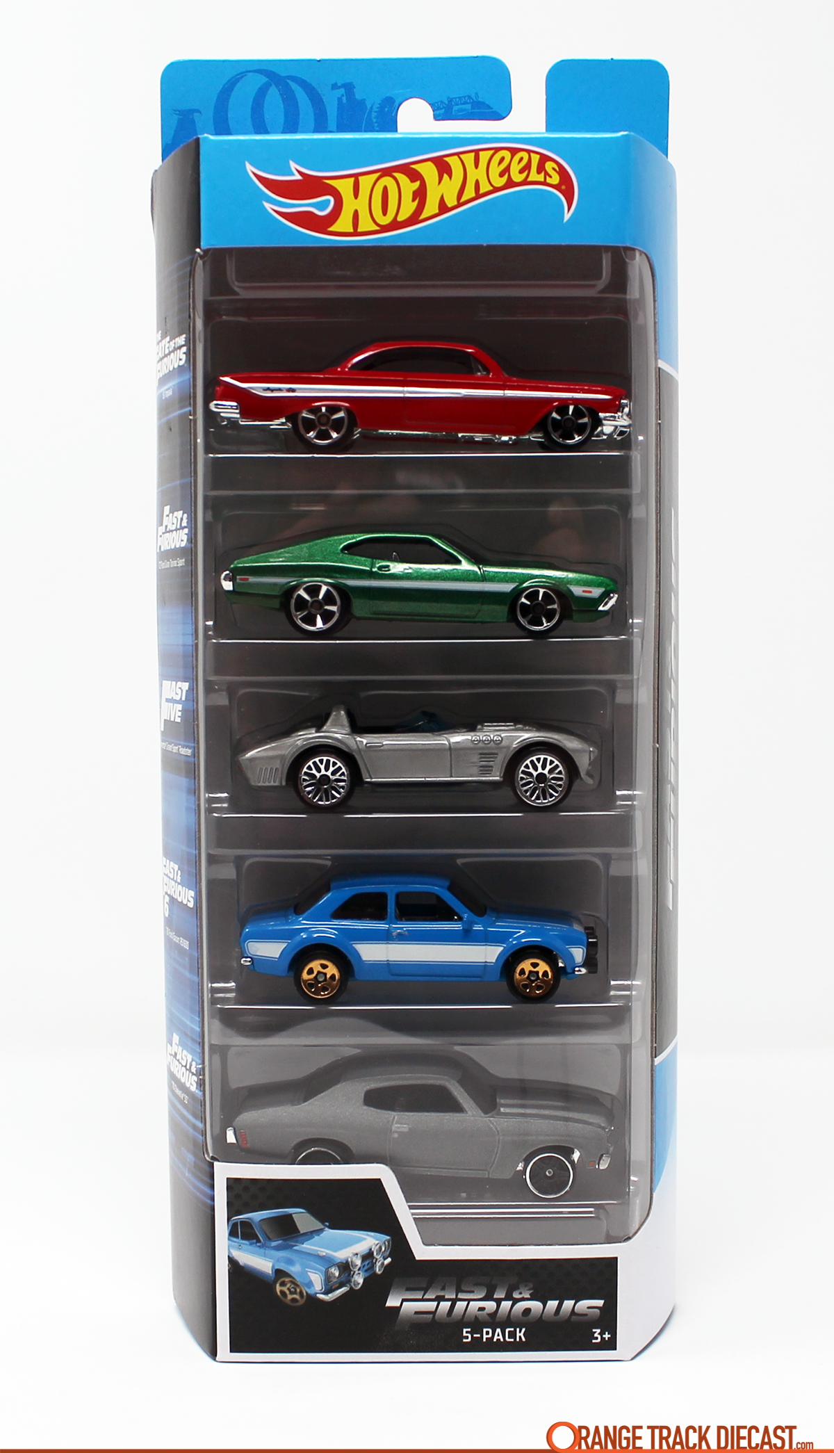 All five cars from the 2019 Hot Wheels Fast & Furious 5-Pack: ’72 Ford Torino Grand Sport, ’70 Chevelle SS, ’70 Ford Escort RS1600, ’61 Impala and Corvette Grand Sport Roadster (Package View, FRONT)