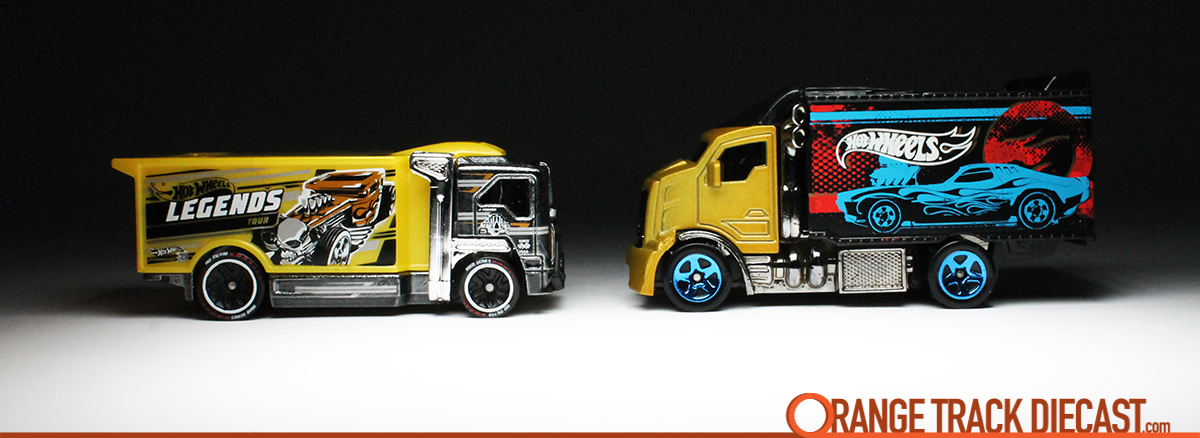 Hot Wheels Hiway Hauler 3.0 from the 2019 Hot Wheels iD / HW Metro series (head-to-head) with the Hiway Hauler 2