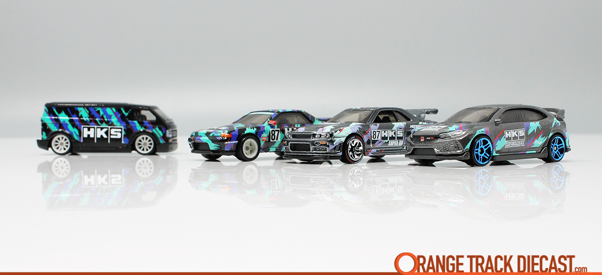 HKS Race Team family photo: ’18 Honda Civic Type R, Nissan Skyline GT-R (BNR34), and Nissan Skyline GT-R (BNR32). Hot Wheels MBK Van in HKS livery from the 2021 Pop Culture / Speed Shop Garage series in the back