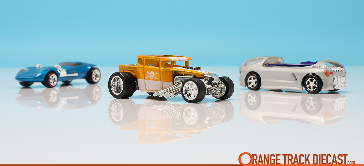 Hot Wheels 2020 Boulevard: Twin Mill (left), 2007 Street Show: Bone Shaker (center), and 2003 Hall of Fame: Deora II (right)