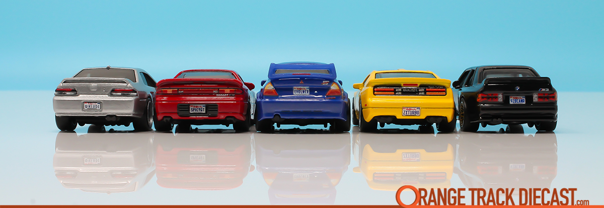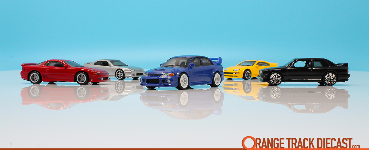 Hot Wheels 2021 Car Culture / Modern Classics series: Mitsubishi 3000GT VR-4 (red), ’98 Honda Prelude (silver), Mitsubishi Lancer Evoltion VI (blue), Nissan 300ZX Twin Turbo (yellow), and ’92 BMW M3 (black).