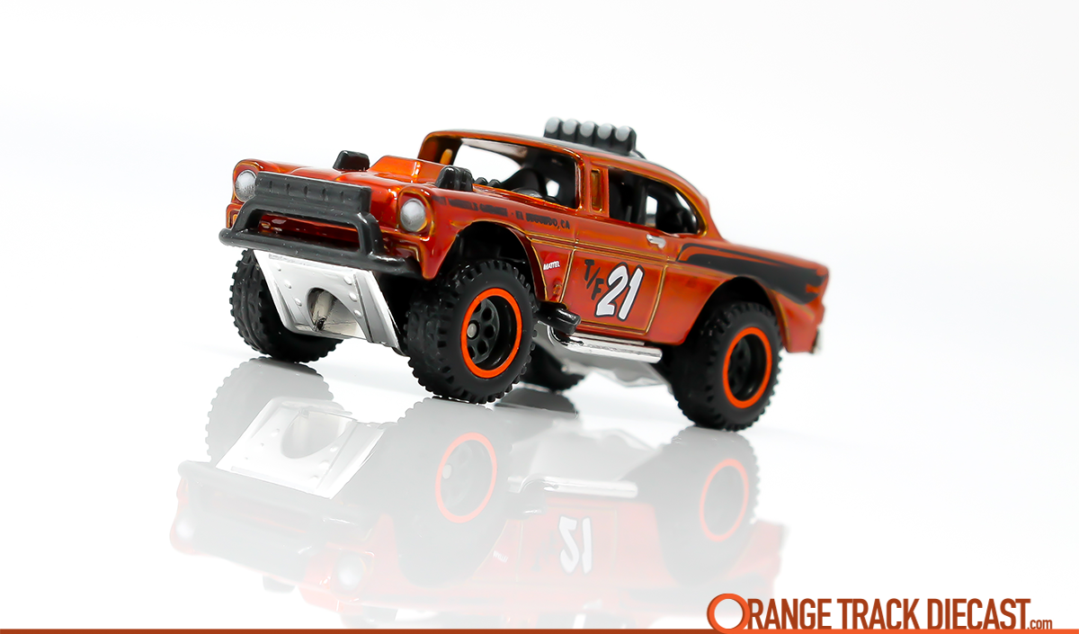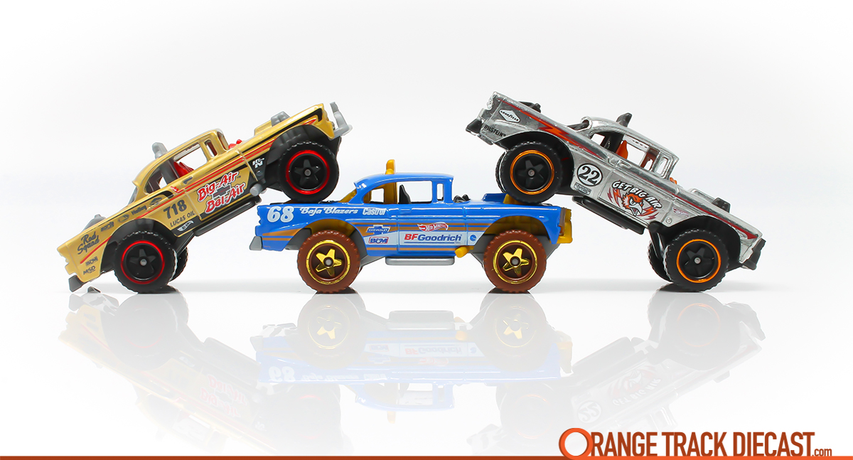 From the name to the ingenuity, the #Big-Air Bel-Air represents so many things that make Hot Wheels vehicles great. The name of this casting could have simply been “’56 Off-Road Chevy Bel-Air” and everything would have been just fine, however, Brendon threw it back to the old school Hot Wheels days when casting names had a little more flavor. With “Big-Air” in front of its Bel-Air namesake, the name lends itself to the fact that this is an excellent track car that is made for some of those patented orange track jumps. Every mainline release of the casting thus far has featured the #Baja 5-Spoke Wheels which are the only off-road Hot Wheels wheels designed to work well on track.