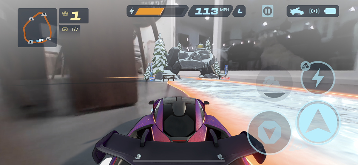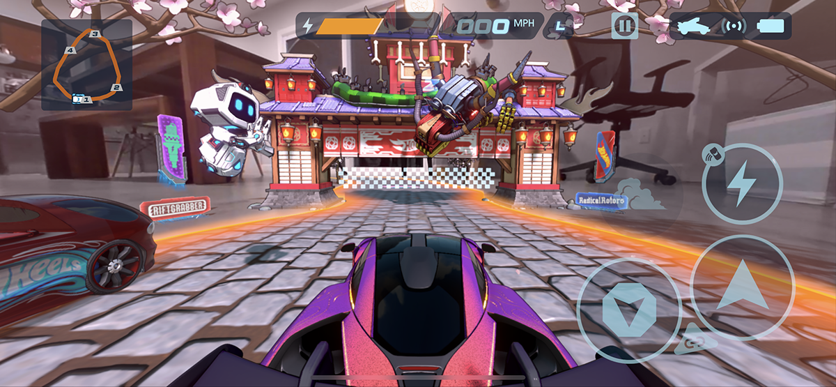 I have really enjoyed playing in Campaign mode. In this, you set up your physical gates that come straight out of the box, and use them to create a mixed-reality track through whatever physical environment you choose. So far I have managed to created a somewhat vanilla track that meanders through my kitchen, however, I can see the creatively side to this where kids are probably already creating multi-level tracks across a variety of surfaces. The other mode is stunt mode. I have found this mode useful to train in as we as use it to chain together drifts, wheelies, and burnouts to net rewards.