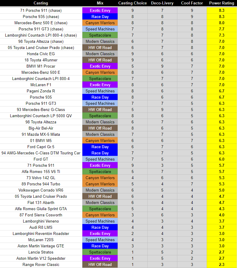 I would like to thank my fellow collectors who participated in helping me rank these. These #Power Ratings give you a glimpse as to what you can expect the demand to be at retail when these appear and this exercise has definitely proved itself this year. I gave each person a chance to speak to the car they felt the most strongly towards — positive or negative — and you’ll see below that the interest in certain models justifies their Power Ratings.
