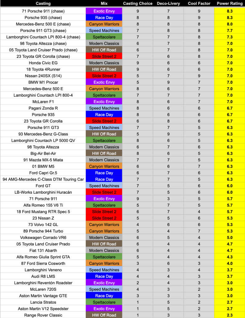 For a change, I am going at these #Power Ratings alone. My goal is to give you a glimpse as to what you can expect the demand to be at retail when these appear and this exercise has definitely proved itself this year. This was a hard mix to access as there isn’t a bad car in it. My least favorite car is actually the #Chase, but it will still be the first to go for obvious reasons.