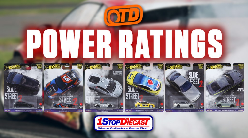 We have finally reached the final #Power Ratings for 2023 Hot Wheels #Car Culture: Slide Street 2. Crazy that it is March of 2024 and we are first seeing the images now. It will be exciting to move onto 2024 as it is currently the only part of the 2024 master list that needs work. As evidenced by the name, this is the second time we’ve seen the Slide Street mix in the line. The #Nissan 240SX (S14) and #’18 Ford Mustang RTR Spec 5 return in new decos, while being joined by another GR Toyota, and two #Drift Cars with licensed decos.