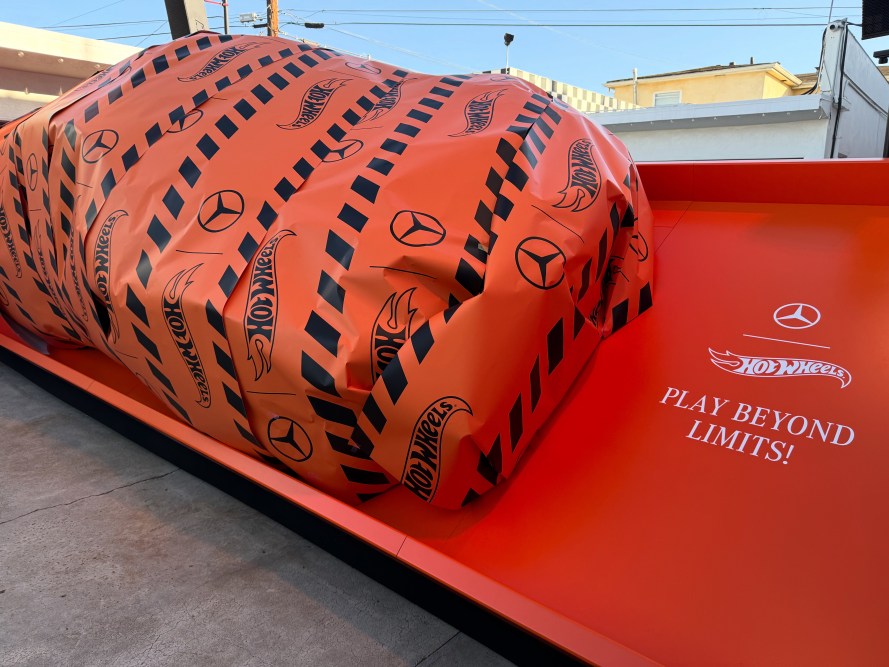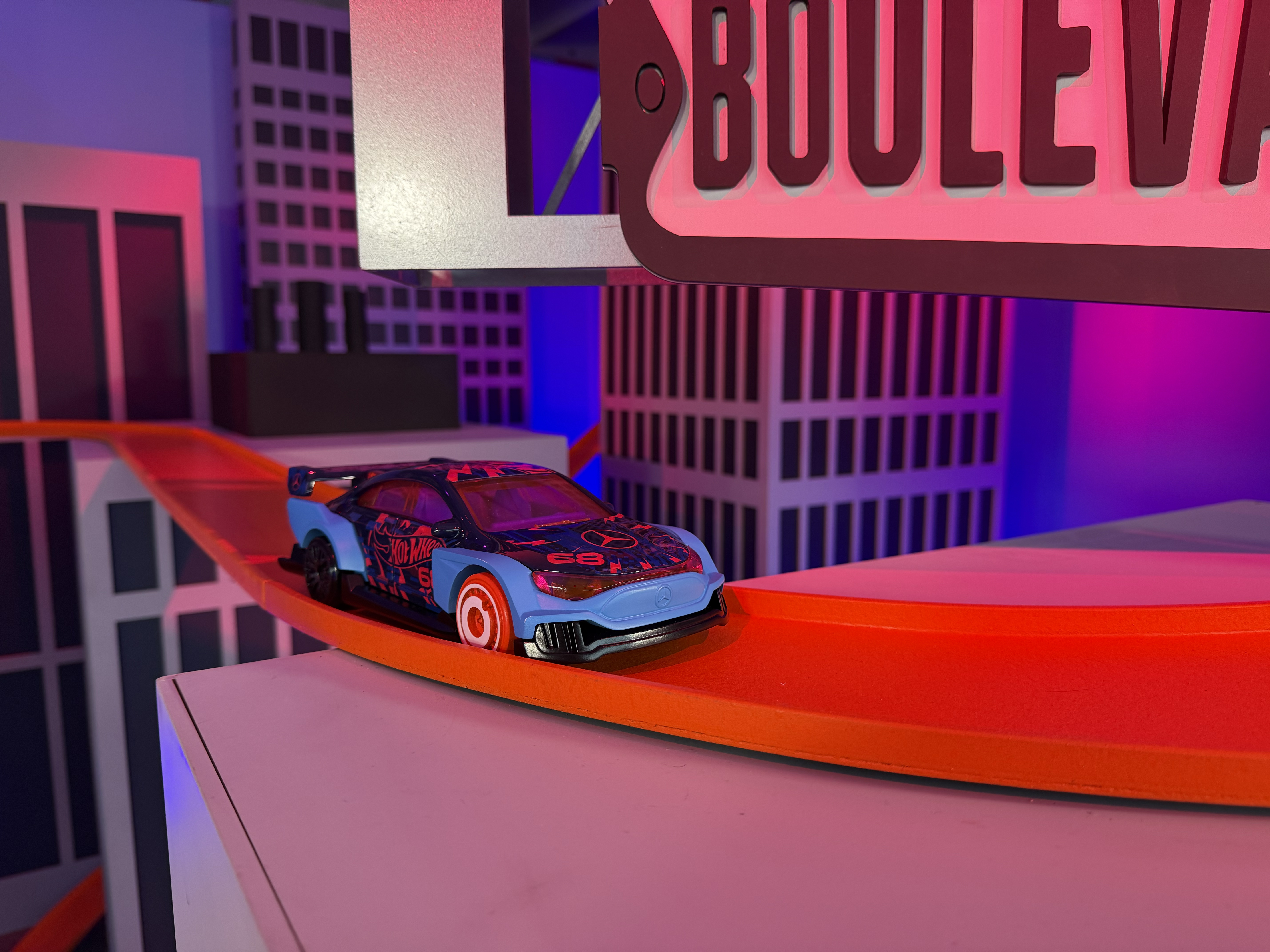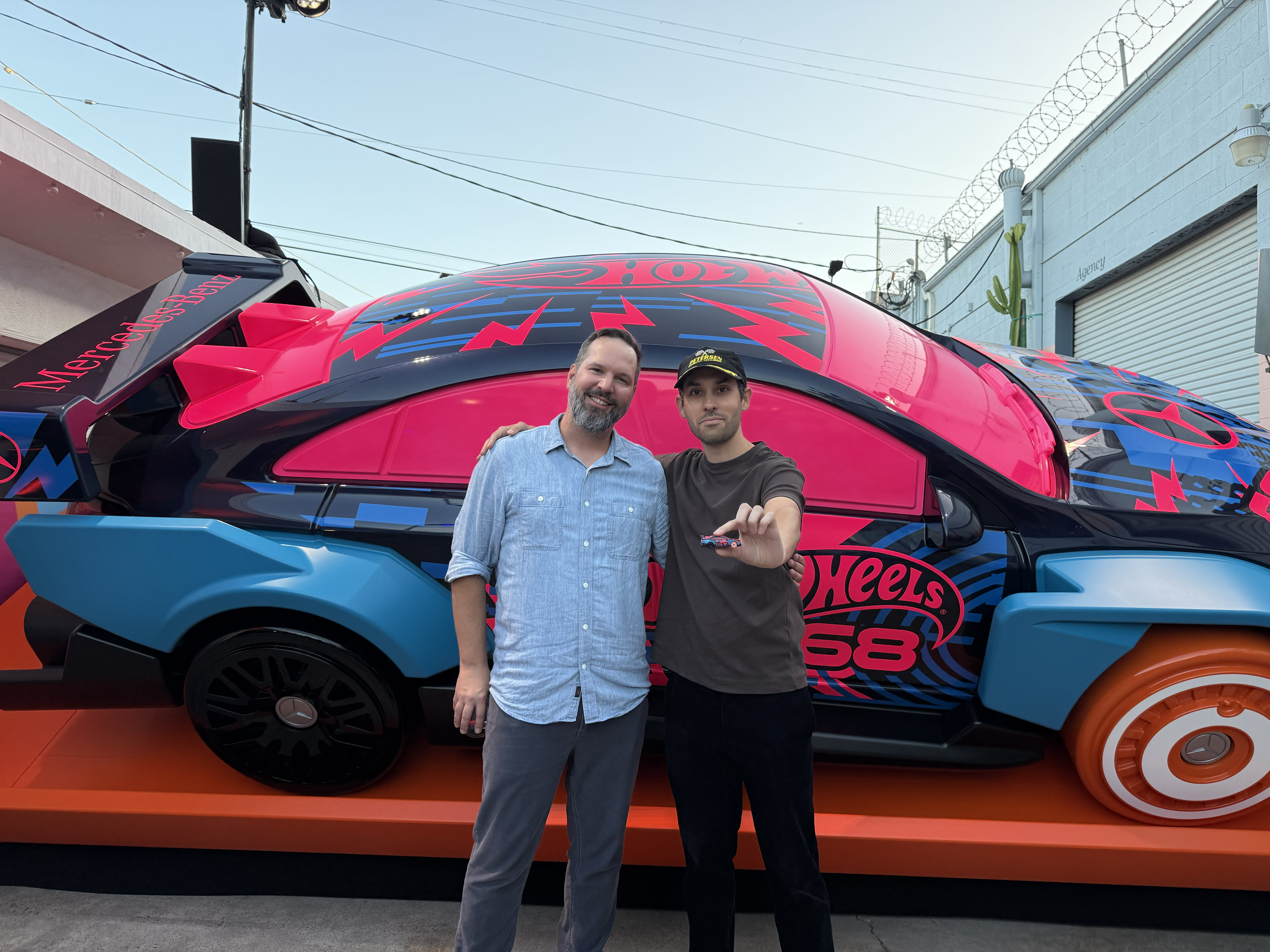 10/4/2025 — While in town for the LA convention, I finally had the opportunity to check out one of the many fantastic Hot Wheels events at Race Service — a local ad agency dedicated to the automotive industry. I was told there would be an unveiling of a Hot Wheels collaboration with Mercedes and the event did not disappoint! Immediately upon walking into the space, you were greeted by a 1:1 Mercedes-Benz CLA and this beast, wrapped in “orange track” paper.