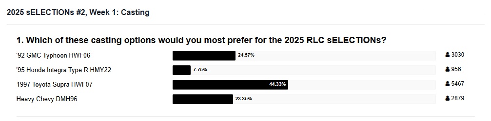 10/21/2025 — Back in July, Hot Wheels collectors voted the #’97 Toyota Supra into production — easily beating the competitors in the 4-vehicle poll with 44.33% of the total vote. Collectors would ultimately vote on color and wheels in subsequent rounds. Long-time, Hot Wheels RLC graphic designer, Steven “HWCVAN” Vandervate, decided to give this one a wild, HKS “oil splash motif” since the previous release, and upcoming 2025 release, are both clean — free of additional deco.
