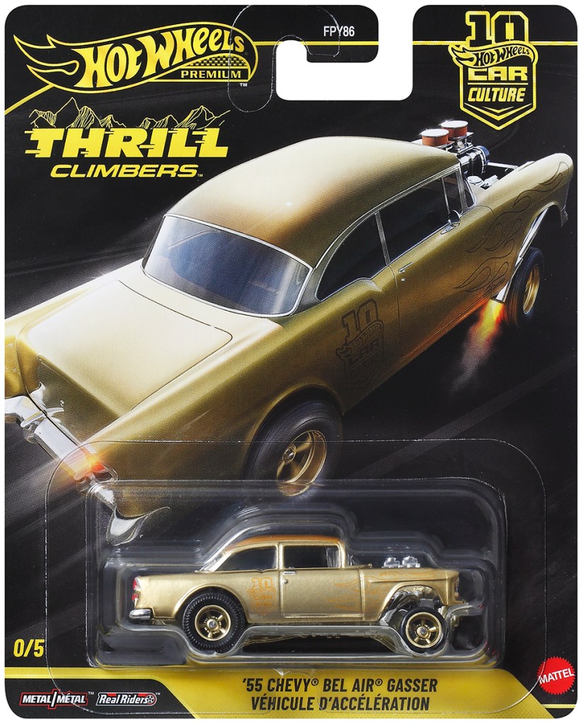 The 10th Anniversary of Hot Wheels #Car Culture rolls on — or “up” in this case — as Thrill Climbers hits retail. Again, the chase vehicle in each mix for 2026 is not all-black like in previous years. Rather, the vehicle, the #’55 Chevy Bel Air Gasser in this case, comes in satin gold with a 10th Anniversary of Car Culture logo on it.
