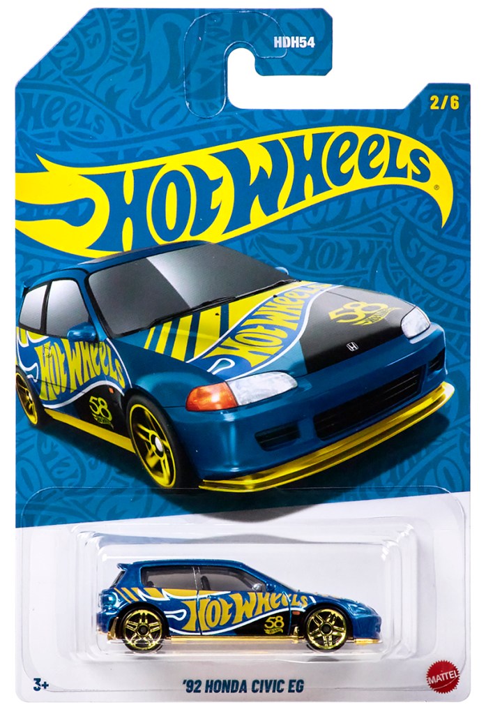 The first mix of the #Anniversary Series for 2026 celebrates the 58th Anniversary of Hot Wheels — continuing on this themed basics series that started in 2018 for the brand’s 50th anniversary. Every mix contains 6 vehicles with one of them being the #Chase, which is limited to 1 per case of 24.