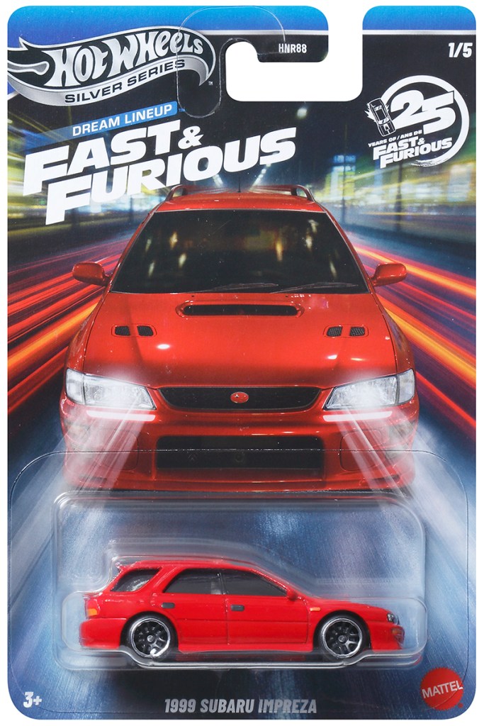The first car in the series (1/5) is the ’99 Subaru Impreza — a brand-new casting! If you are thinking to yourself, “I’ve never seen this car in Fast & Furious”, then you’re right. The car this one references is a red Subaru with silver trim from the racing scene in Rio de Janeiro in Fast X (2023). It may be a background car, but this wagon version of the Impreza has been a long time coming!