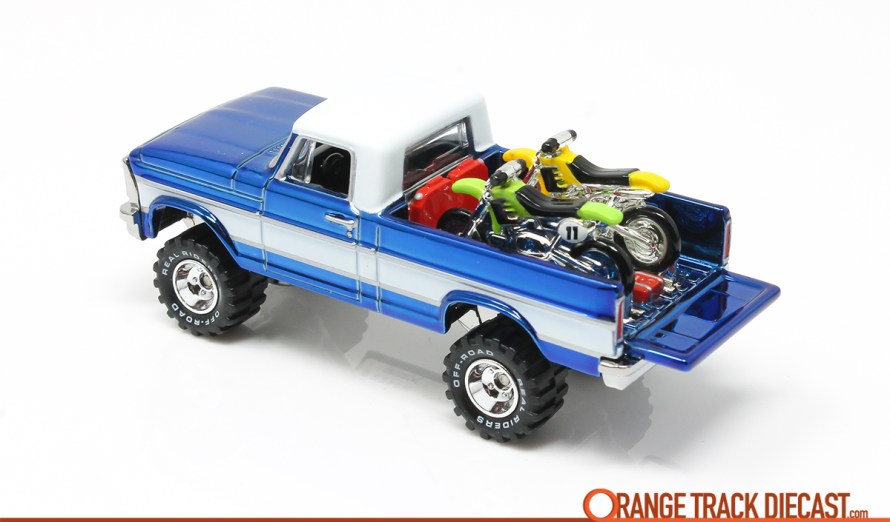 The 2013 Flying Customs line at Target was one of the more diverse lineups of Hot Wheels castings that we’ve ever seen. The lone pickup truck? The Texas Drive ‘Em. The light blueish gray bikes in the back closely match the tampo of the same color on the sides. This was the only TDE release to feature bikes of that color, and the only release to wear construction (CT) wheels.