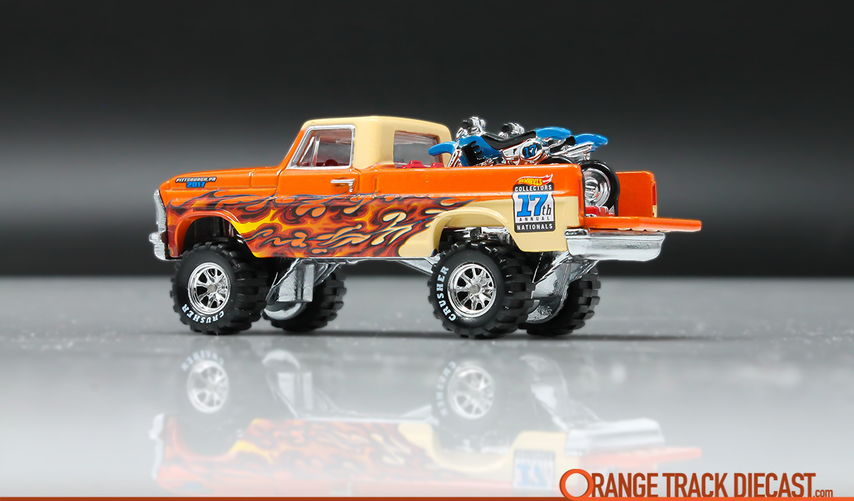 Six months later, the Texas Drive ‘Em would get it’s second (and last) convention release. The 17th annual Nationals event in Pittsburgh is known for being one of the last conventions with very low quantities on souvenir vehicles. This release in bright orange had only 2,800 pieces produced. This was also the first TDE release to feature Knobby Real Riders 10-Spoke Wheels and the last TDE release to feature detailed dirt bikes in the back.