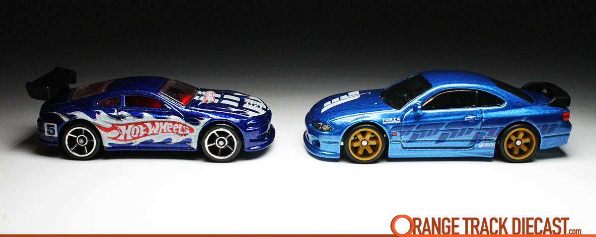 Hot Wheels Nissan Silvia S15 from the 2018 Replica Entertainment / FORZA Motorsport series with the 2008 Team: Hot Wheels Racing release of the older casting (head-to-head view)