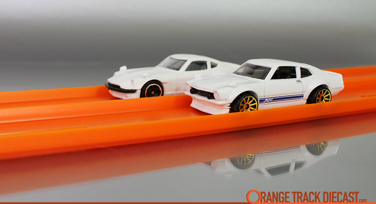 Hot Wheels Custom Ford Maverick from the 2018 Factory Fresh series with the other Sung Kang car, FuguZ, a Custom Datsun 240Z from the 2017 Factory Fresh series (side-by-side track view)