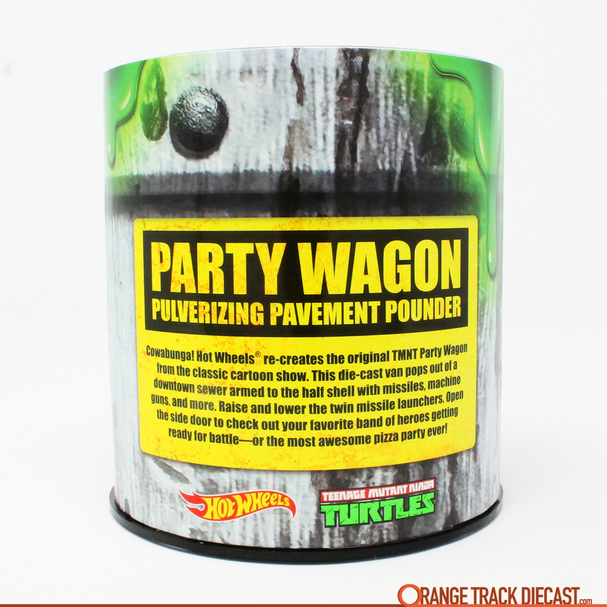 Hot Wheels Teenage Mutant Ninja Turtles (TMNT) Party Wagon, a 2019 San Diego Comic Con (SDCC) Exclusive (rear of sewer can package)