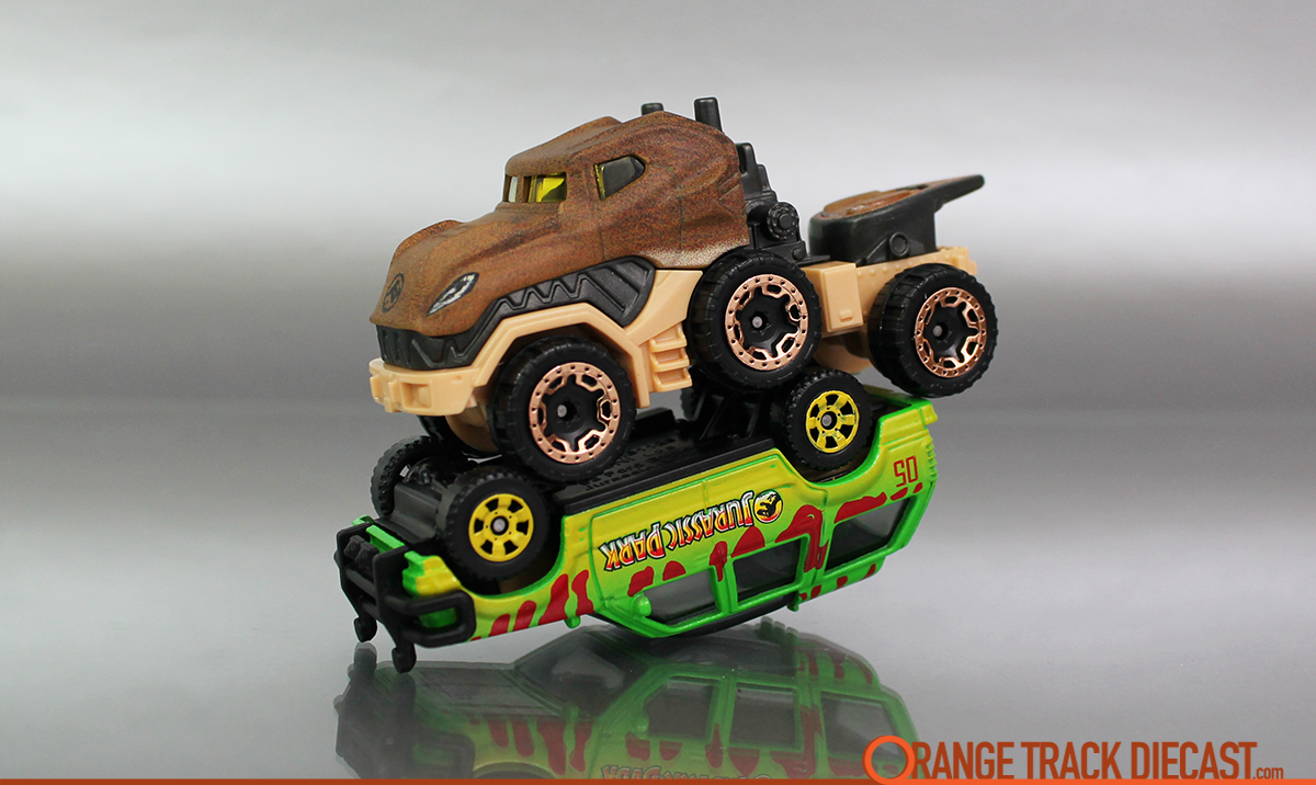 Hot Wheels Tyrannosaurus Rex from the 2018 Character Cars / Jurassic World Series on top of the Matchbox Jurassic Park Ford Explorer