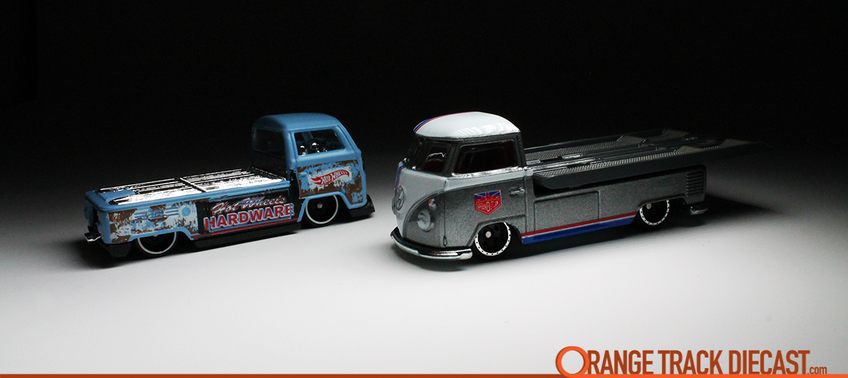 Hot Wheels Volkswagen Transporter T1 Pickup from the 2018 Car Culture Team Transport line featuring Magnus Walker Urban Outlaw Livery with Volkswagen T2 Pickup (Dark View)